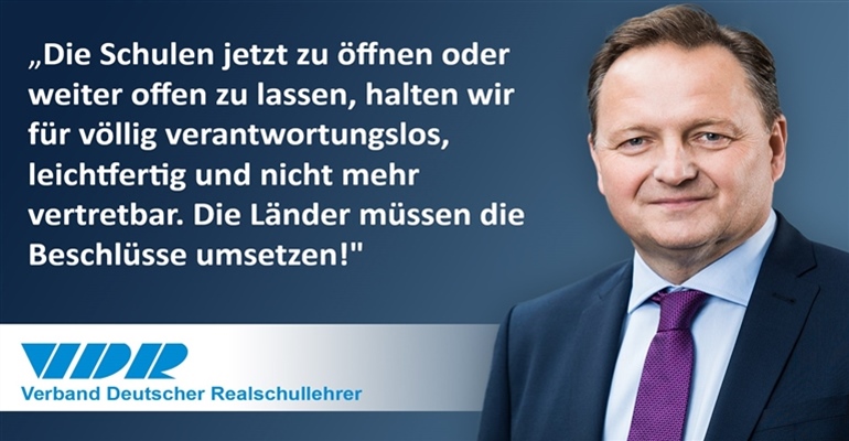„Mit der Entscheidung, die Schulen bis Mitte Februar geschlossen zu halten, kommen die Bundeskanzlerin und die Ministerpräsidenten den Empfehlungen der Virologen und Experten nach. Und das ist richtig so!“, betont Jürgen Böhm, Bundesvorsitzender des Deutschen Realschullehrerverbands (VDR).