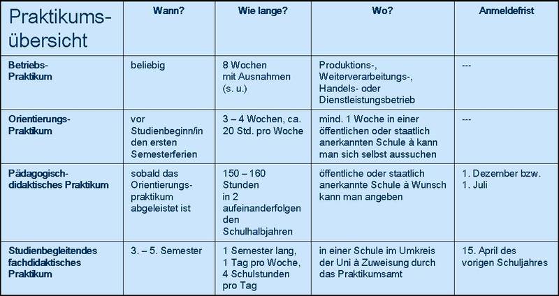 - Ausnahme: Wirtschaftswissenschaften: dreimonatiges kaufmännisches Praktikum (anstatt Betriebspraktikum)